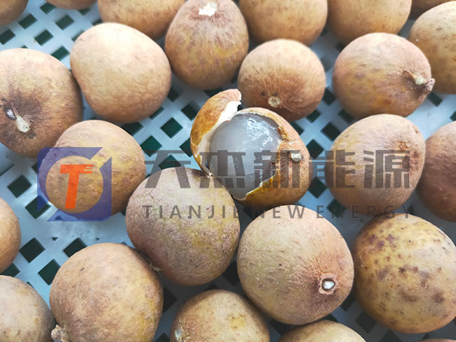 初烘:將龍眼均勻的攤放到龍眼桂圓烘干機(jī)推車(chē)上,初始溫度設(shè)定為55℃,烘干時(shí)間為8個(gè)小時(shí)左右,初烘完成的成品是外殼堅(jiān)硬,果肉呈黃褐色或赤褐色并帶油光,有細(xì)小皺紋,果核外皮易脫落,核仁淡白色。